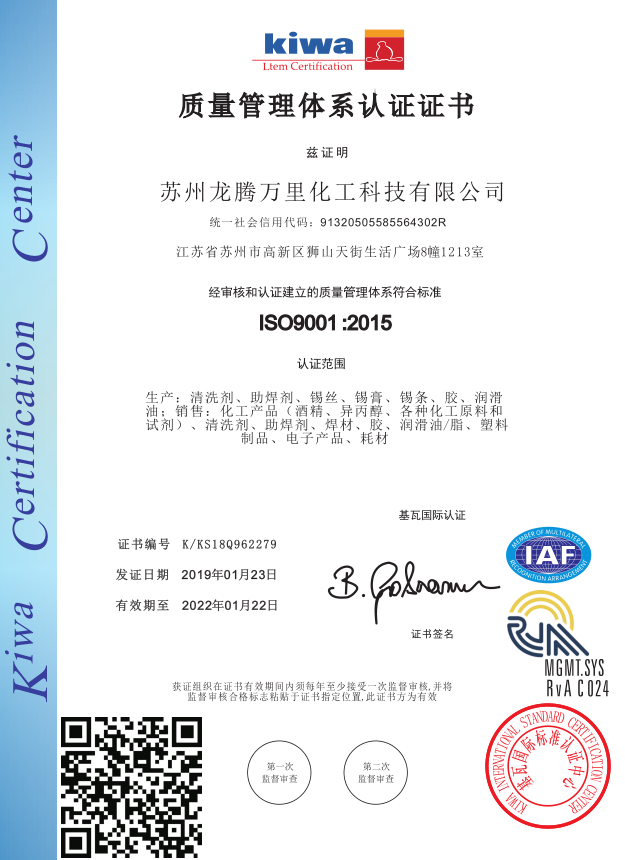 热烈庆祝我司苏州龙腾万里化工科技有限公司通过ISO9001:2015质量管理体系认证,证书编号 K/KS18Q962279,有效期至2022年01月22日。